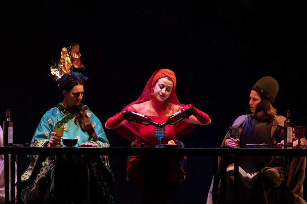 La scena (efficacemente spartana e decadente, curata da Barbara Bessi) si apre ospitando una festa di promozione: quella di Marlene, responsabile di un’agenzia di collocamento londinese. Lussureggianti sono gli abiti delle invitate (la cui cura è affidata al magnifico estro di Daniela Ciancio). Ma sotto il vestito scopriremo esserci una gran miseria esistenziale: Marlene infatti nonostante la brillante promozione, riesce a tollerare i racconti relativi alle condizioni che hanno reso possibili i successi delle sue invitate (non così dissimili dalle sue) solo grazie al copioso vino rosso che continua a mescersi.