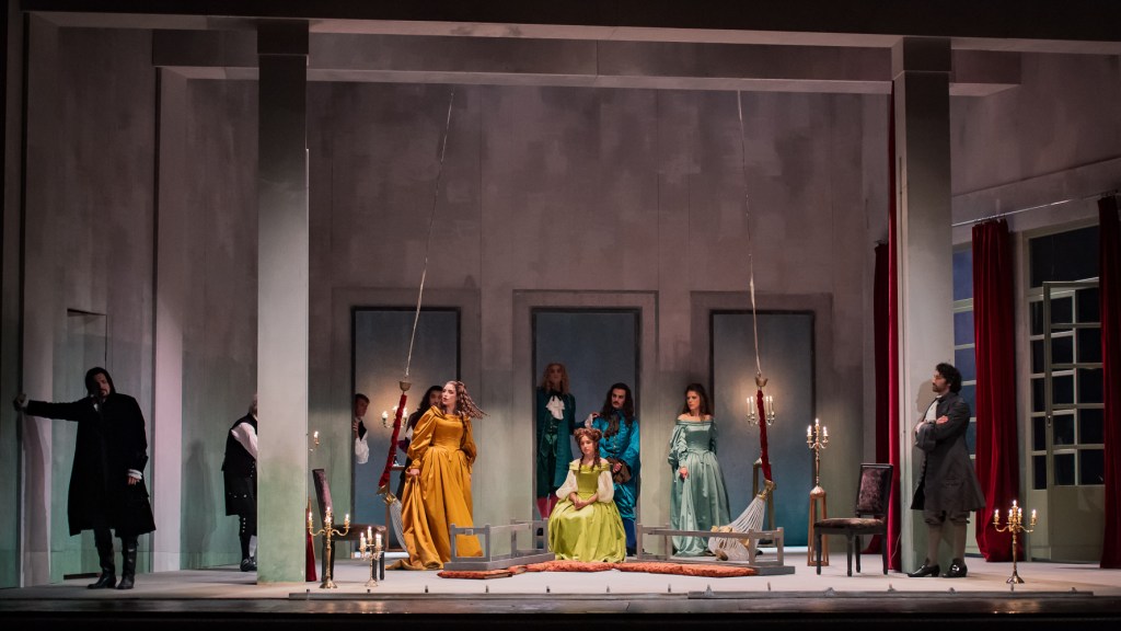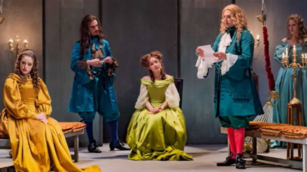 Interessanti i contrasti – che non escludono consonanze – sviluppati tra i rivali in amore. In primis, il carismatico Oronte di Corrado D’Elia, colmo dell’intensa energia del viola melanzana. Ma anche lo styloso Clitandro di Filippo Lai, dal crine platinato e dallo charme che si sprigiona proprio da quell’esotico “punto di rosa”. Senza dimenticare il sofisticato Lacasta di Vito Vicino : fasciato dall’eleganza dell’ambiguo ottanio.