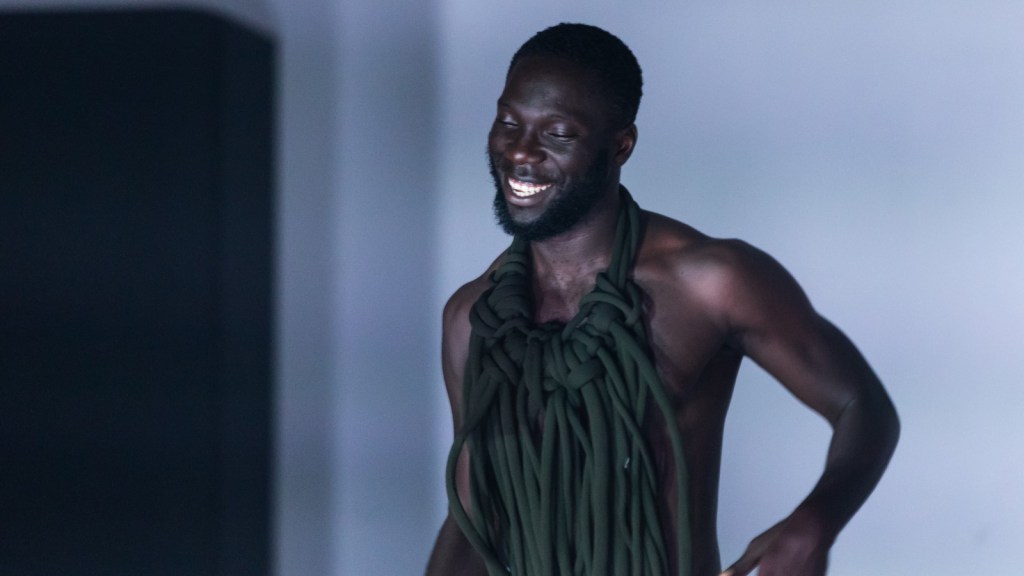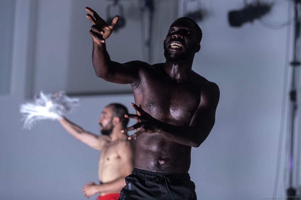 Mani e piedi li raccolgono; tutto il corpo li ‘indossa”. Come si fa con certi pensieri, con paure camuffate da certezze. Con i pregiudizi. Ciò che sembrava solido, rivela ora crepe di comunicazione tra etnie. Tra Africa e Europa. I corpi dei performers alludono a territori e a confini che opprimono, che non lasciano spazio alla libera, diversa, fertile, espressione.