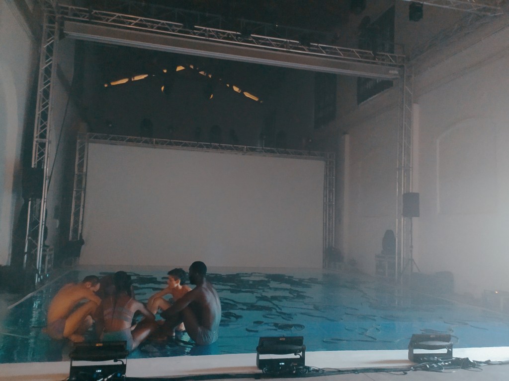 Un muro d’acqua proiettato sul fondale. Un mare che non apre, come sarebbe nella sua natura, bensì chiude. Cinque performers, di diverse etnie, si avvicinano all’acqua, tanto da farci pensare di essere sul punto di tuffarsi, attraversandolo questo “muro”. Invece no. Succede qualcosa di diverso. Inaspettatamente si voltano verso noi del pubblico: un gran fragore, quasi uno scoppio.