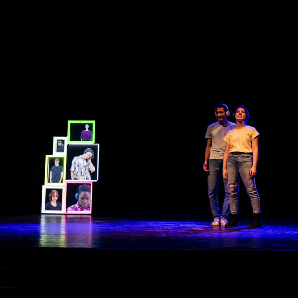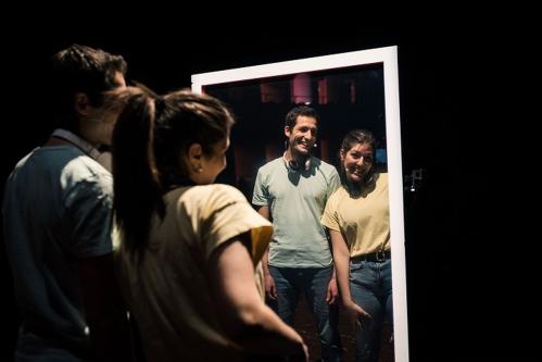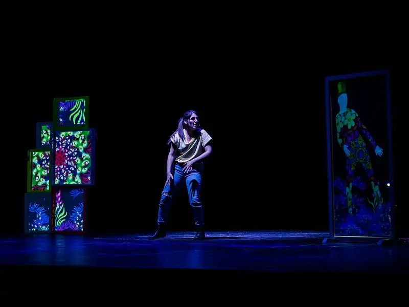 Oltre che canto e danza la narrazione è una giostra: una struttura girevole nella quale occupare un posto. Accanto agli altri. Un intrattenimento, uno spettacolo vitale carico di confusione turbinante, dove non è semplice trovare di volta in volta equilibri sempre nuovi. In bilico tra sogni e precarietà; tra l’entusiasmo del colore rosso e la chiusura del colore nero, che assorbe luce anziché rifletterla. Colori che danno forma alla scena, metafora dei diversi “habiti” della psiche della protagonista. Spesso “frullati” dal vortice alimentato da sfere girevoli ai piedi di elementi apparentemente stabili.