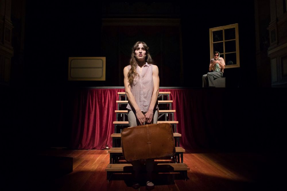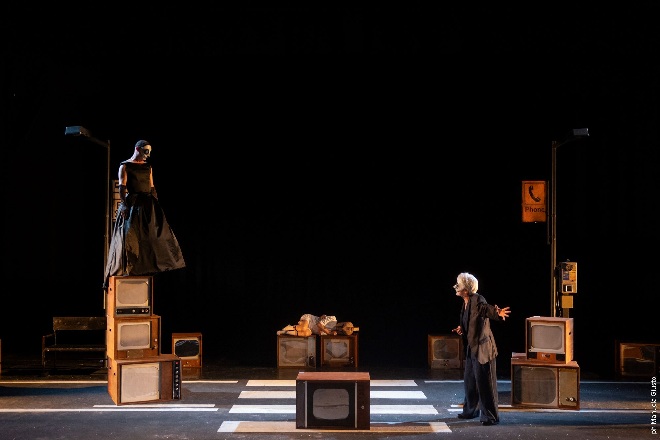 In uno spazio densamente simbolico – il cui progetto scenico è curato da Marta Crisolini Malatesta – tre aperture fanno da confine al passaggio tra ciò che è interno e ciò che è esterno, tra il sopra e il sotto. Tra il sogno e la veglia. Tra il guardare e l’essere guardati.