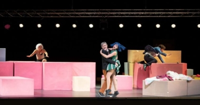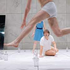 Quel ritmo che, qui in Rifici, è immanente e trascendente il contesto teatrale – ricco com’è di riferimenti extratestuali quali “Tanto rumore per nulla” di Shakespeare, “I giganti della montagna” e “Sei personaggi in cerca d’autore” di Pirandello e ancora la Maieutica socratica. E che diviene una denuncia giocosamente perspicace della nostra ipocrisia esistenziale, nonché del nostro impoverimento esperienziale su “ta erotika”: quelle “cose dell’amore”, di cui Socrate parla nel “Simposio” di Platone.