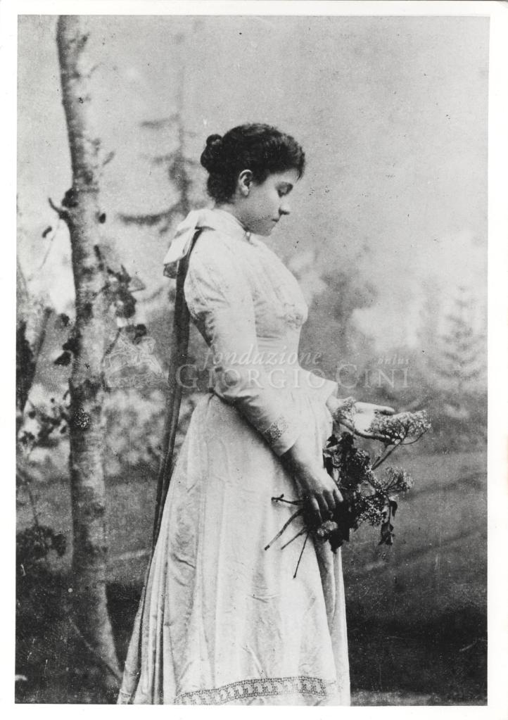 La Kustermann indossa della piccola bigiotteria, proprio come amava la Duse: non serve altro per sottolineare il suo incarnato autenticamente vivo. Dall’avvincente panneggio del mantello, s’intravede un abito di leggero chiffon nero. Gli abiti erano la passione della Duse.
