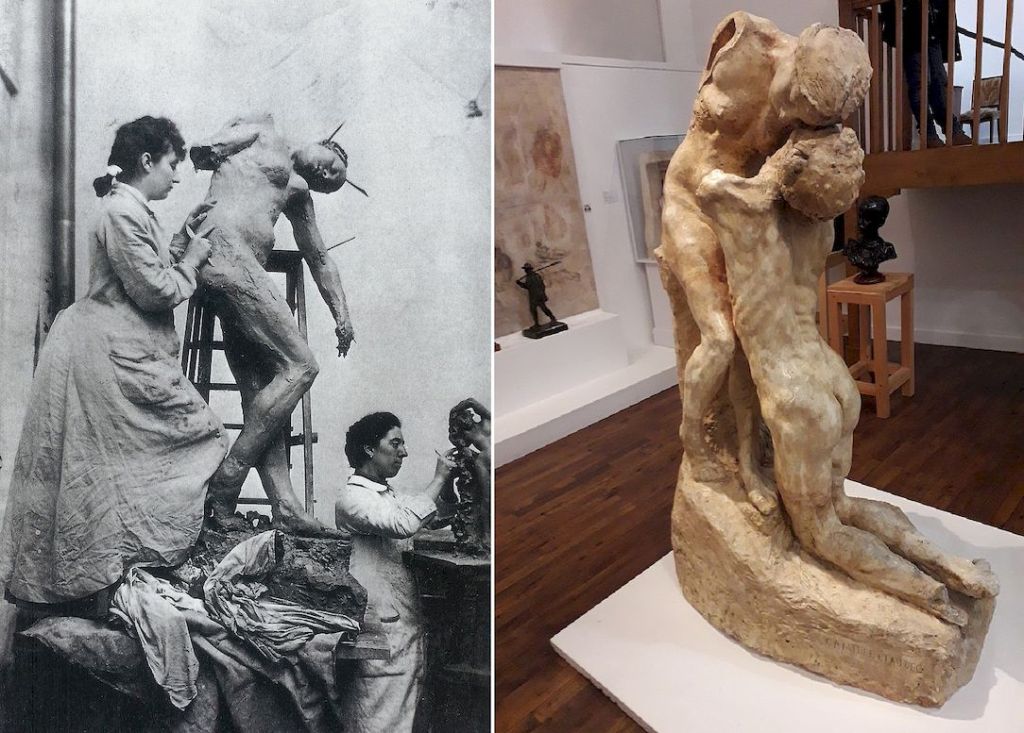 A sinistra, Camille Claudel nell’atelier che occupava al numero 117 di rue Notre-Dame-des-Champs nel 1887, mentre lavora al gesso di Sakuntala; sullo sfondo, Jessie Lipscomb, sua amica e collega di lavoro (fotografia di William Elborne, fidanzato di Lipscomb) . A destra, il gesso originale dell’opera, in quegli stessi anni donato e ancora conservato al Museo Bertrand di Châteauroux.