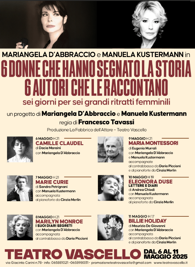 Il progetto di Mariangela D’Abbraccio e Manuela Kustermann, curato dalla regia raffinatamente simbolica di Francesco Tavassi, si articolerà in 6 giorni dove ogni replica sarà dedicata ad una grande figura femminile. Raccontata, attraverso diversi registri narrativi, da 6 autori e restituita in forma di reading pensato per due voci: quelle di Mariangela D’Abbraccio e Manuela Kustermann, protagoniste del nostro teatro, interpreti fra le più attente e sensibili della scena italiana.